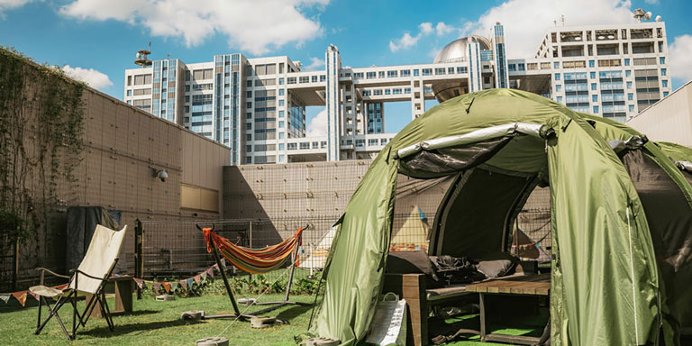 可愛いテントやおしゃれな内装、ソファーやダイニングなど設備が充実。