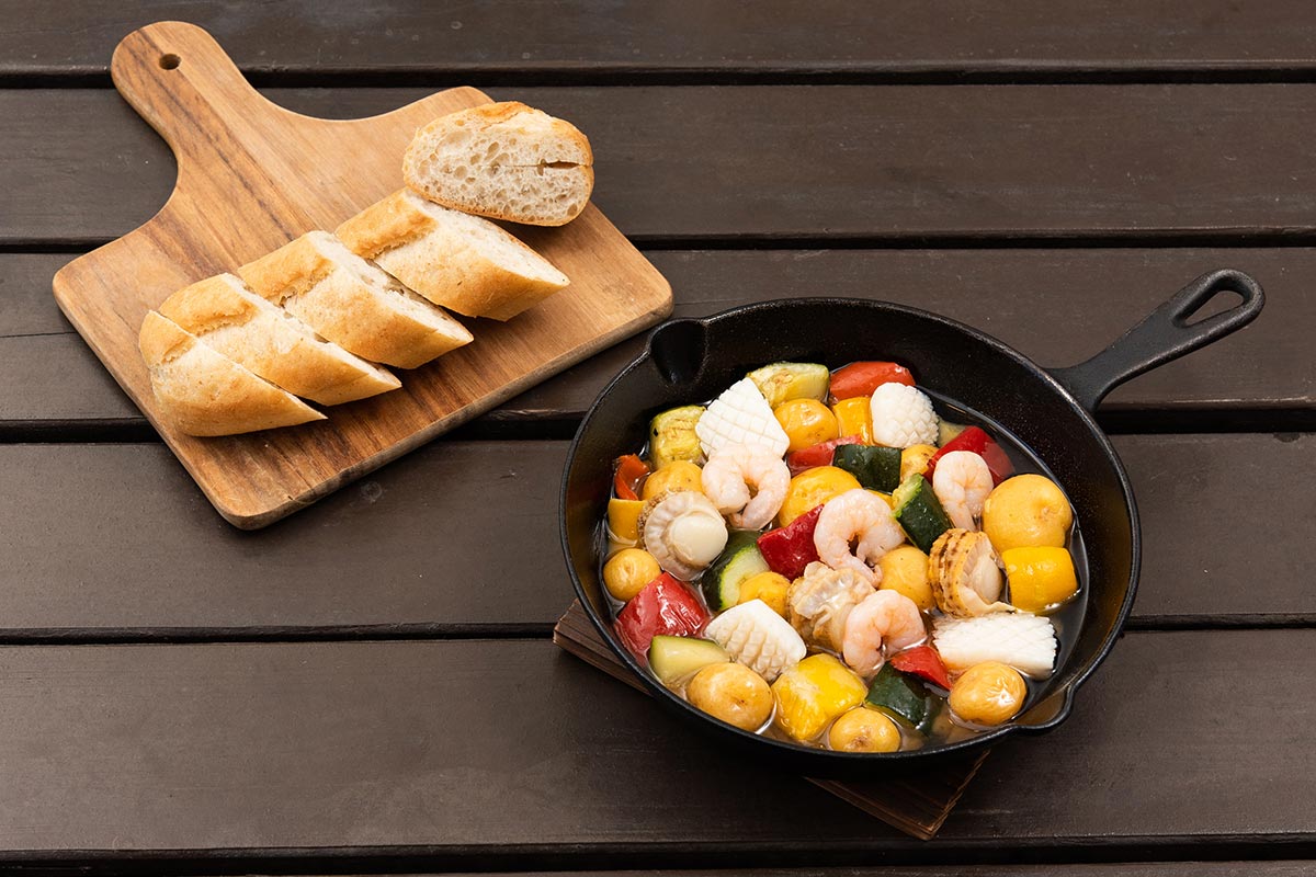 - ・海鮮セット:ホタテ4枚 ・海老4尾 ・イカ2杯