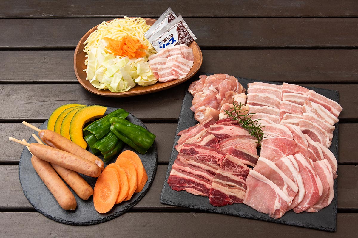 牛・豚・鳥が勢揃いの定番BBQ食材!野菜や焼きそばもセットになったお悩み知らずのセット商品。お肉も野菜もカットされているので〝包丁いらず″、会場に到着して即BBQスタート!