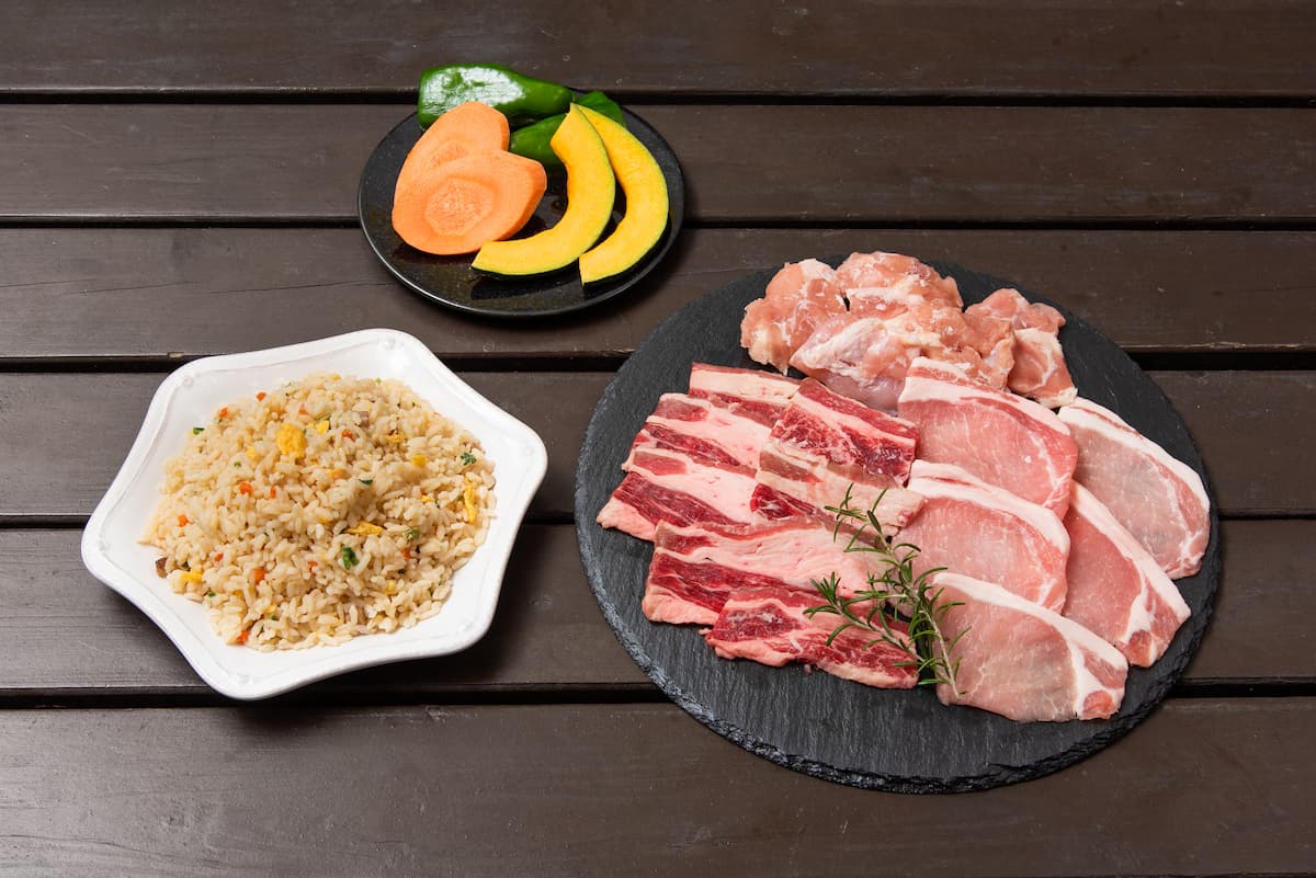 牛・豚・鶏とカット野菜と締めの炒飯が揃う団体向けプラン。すべてカット済みで準備不要、到着後すぐBBQ開始!肉だけで300gの大容量。50名以上の団体に人数分ご用意できます。