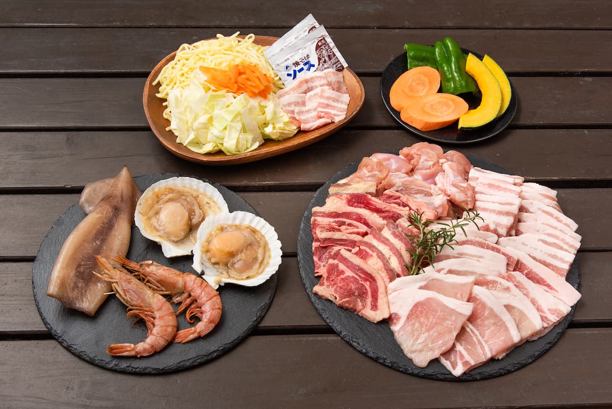 海鮮・肉・野菜・焼きそばが揃う豪華な団体向けプラン。肉と魚介で450g、焼きそばは1人1玉付きで大満足のボリューム!50名以上の団体に人数分ご用意できます。